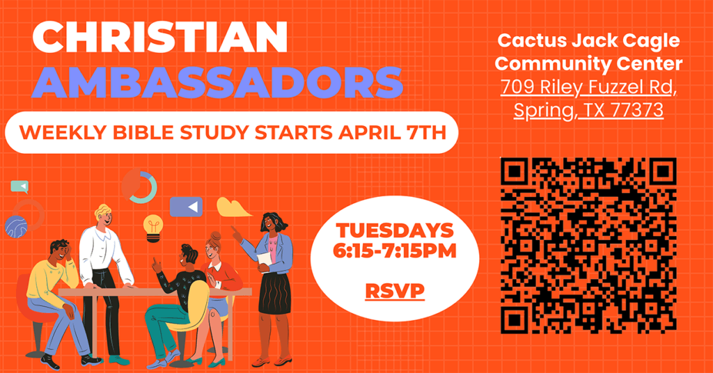 Starting Tuesday April 7th from 6:30 PM - 7:30 PM, Lady Rabekah will lead an 8-week cell group called Christian Ambassadors. This group is open to all. Please scan the QR code or visit the Guest Services desk to RSVP. This group will meet at the Cactus Jack Cagle Community Center located on 709 Riley Fuzzel Rd, Spring, Tx. 77373.